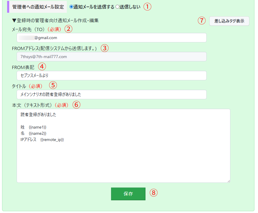読者登録された時に、管理者へ通知メールを送信したい場合はこちらで設定してください。