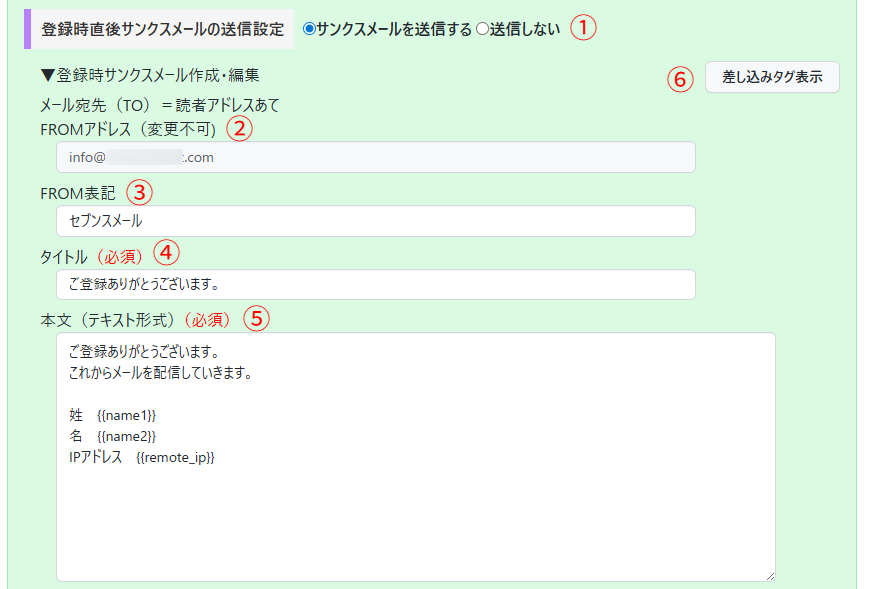 ①登録時直後サンクスメール送信設定
