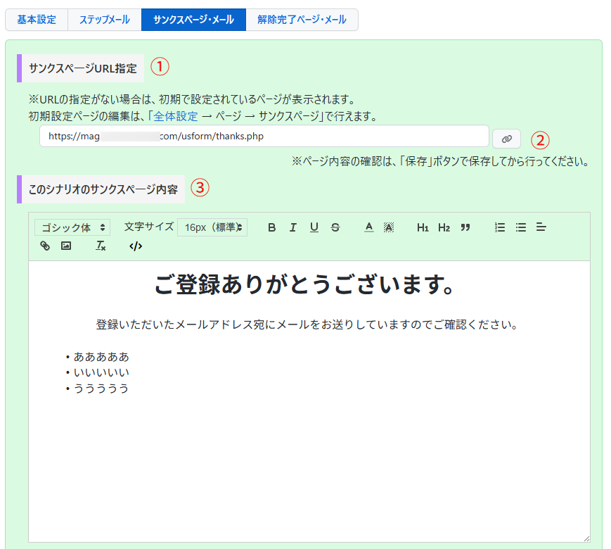 「サンクスページ」とは、読者登録が完了した直後に表示するページのことです。