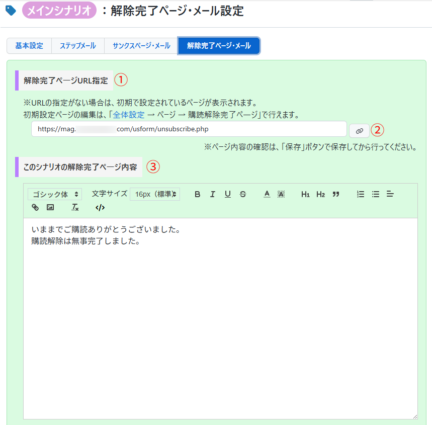 「解除完了ページ」とは、読者が登録解除した直後に表示するページのことです。