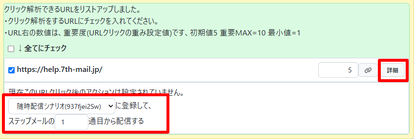 「メール内URLの解析」では、クリック解析をしたいURLの指定や、クリック後に別シナリオに登録する設定ができます。