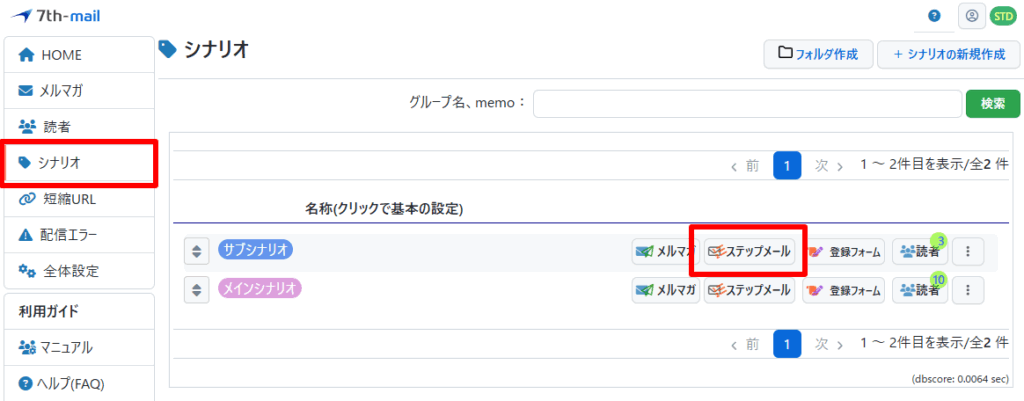 ステップメールを設定するシナリオの「ステップメール」をクリックします。