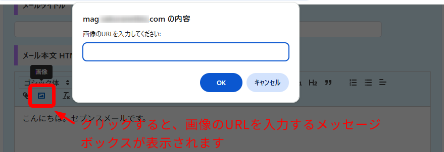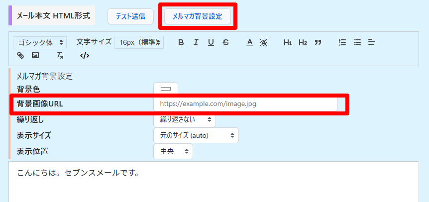 画像の挿入や、背景画像の設定をする場合は、あらかじめ別途サーバーなどに画像をアップロードして、そのURLを記載してください。