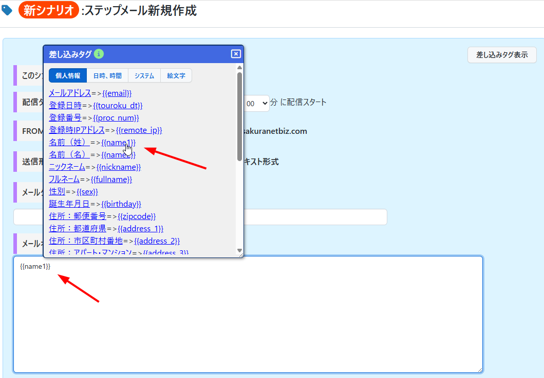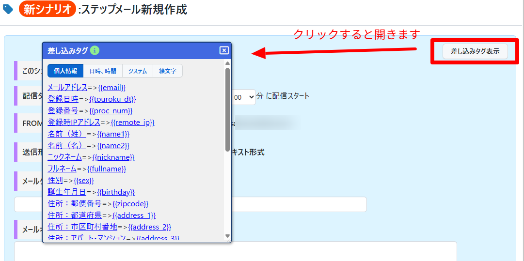 毎回「差し込みタグ」を開かなくても、ここから本文に挿入することができます。