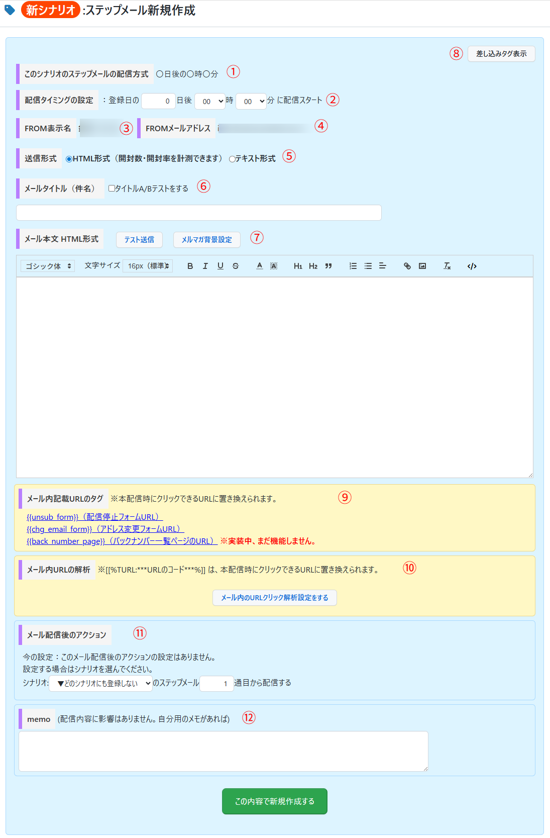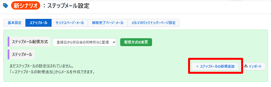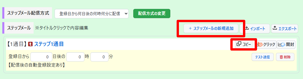 2通目以降のステップメールを作成する時には、「+ステップメールの新規追加」から作成するか、もしくはそれまでに作成したステップメールをコピーして作成してください。