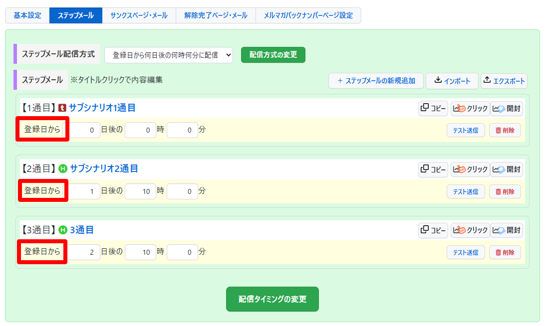 すべて登録日を起点として配信タイミングを設定する形式です。