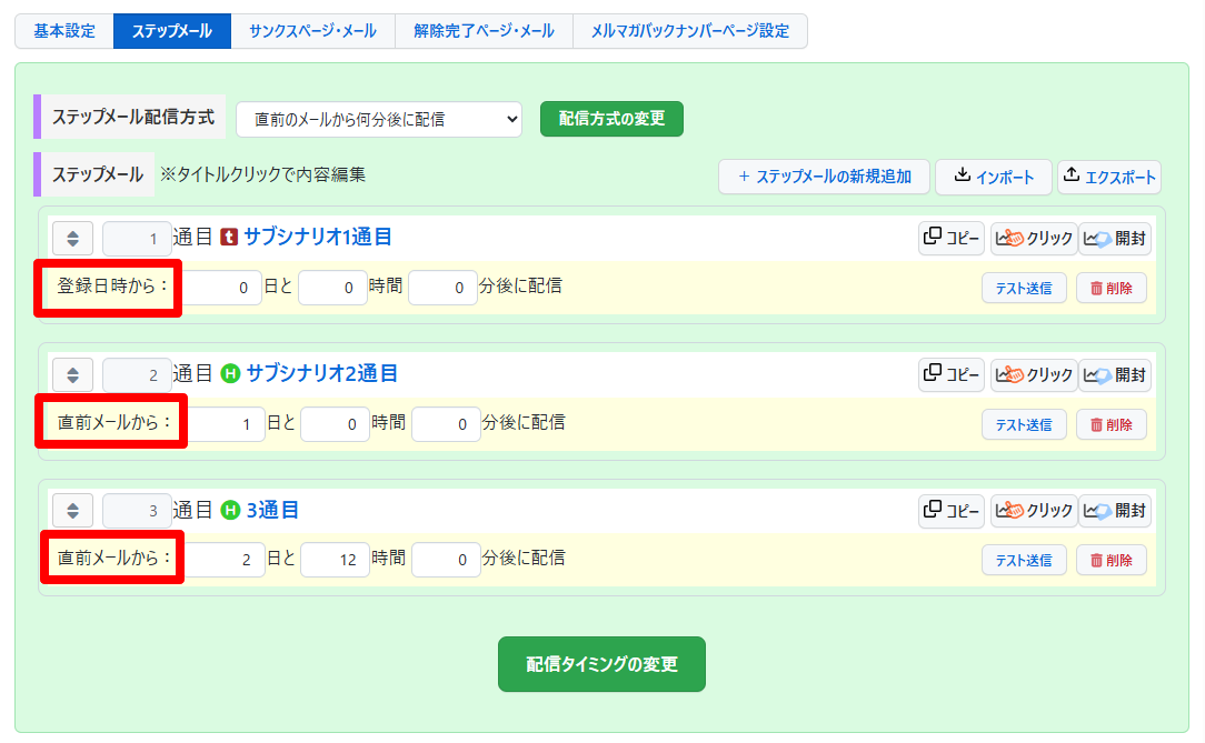 1通目は登録日時を起点とし、2通目以降は直前のメールを起点として配信タイミングを設定する形式です。